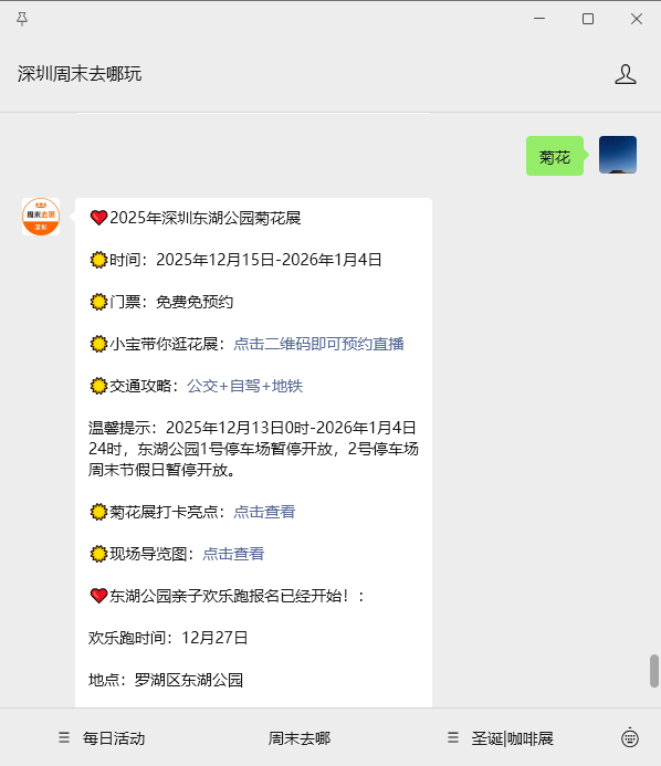 可以扫描上方二维码,跳转至【深圳周末去哪玩】微信对话框复兴【菊花】即可取得深圳东湖公园菊花展亲子跑报名进口
